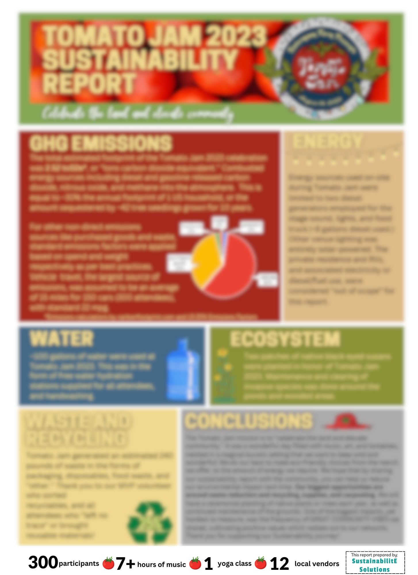 Check out an example sustainability report, authored by SustainabilitE Solutions, for Tomato Jam music festival in 2023